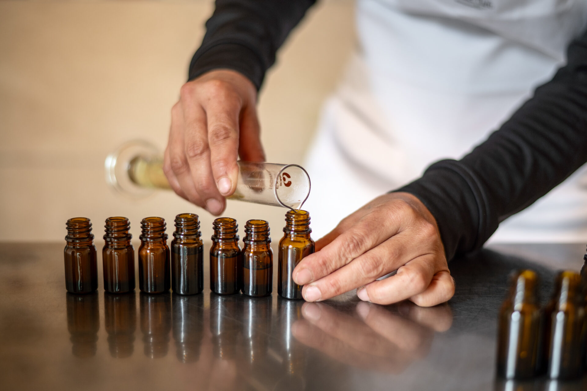 Nel 2012 abbiamo preso ulteriore  consapevolezza dell’energia della terra in cui viviamo, dando vita a una coltivazione di piante officinali.  50000 tra Lavanda Officinalis, Issopo, Salvia Sclarea e Rosmarino, a cui si aggiungono le varietà spontanee che raccogliamo nei nostri stessi terreni, tra le quali Cipresso, Elicriso, Alloro e Finocchio Selvatico. Da quest’anno abbiamo iniziato l’avventura della coltivazione di Canapa Sativa, con la quale stiamo svolgendo interessanti esperimenti di distillazione. Il campo che amiamo e custodiamo insieme a un moderno impianto di distillazione in corrente di vapore permettono ogni anno  la rinascita degli oli essenziali della Terra del Tufo!